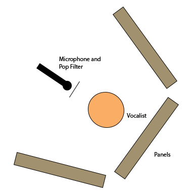 Next, you’ll need to set up a makeshift “booth” for your singer somewhere just off the center of the room. Remember that when using a directional microphone, you won’t need to absorb the area near the rejection of the pattern. It’s best to place the panels behind the singer in a half circle or trapezoidal layout. This will help minimize the amount of sound waves bouncing back into the microphone. If you have a singer who moves a whole lot you may want to eliminate proximity effect by using an omni pattern. Remember though, in this scenario you will need to absorb from all directions.