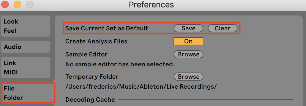 Ableton gives you the ability to save your current sessions as default. Therefore, every time you open Ableton and/or create a new session you will have your own customized layout. To do so, simply go in your Ableton preferences (⌘,) and under File Folder, you may “Save Current Set as Default”: Press “Save” and your current session is now default. You may “Clear” and go back to Ableton’s default set anytime.