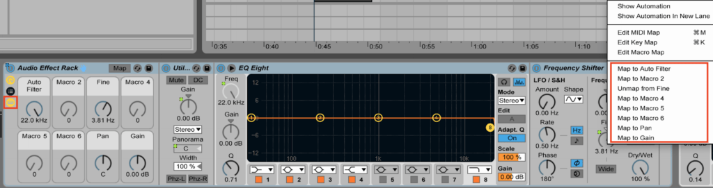 Using the same method, you can save a whole Effect Rack to have all of your favourite utilities from different plugins. To do so, drag the audio effect plugin into an effect rack, right-click the parameters that you want to have easy access to, and select which macro you wish to control (Map to Macro).