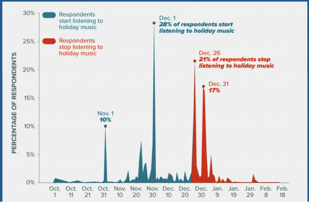 Selon une analyse du rapport Nielsen Music 360, le fait que les gens ne veulent écouter que les classiques est un mythe. Les données montrent que les préférences pour les classiques et les chansons contemporaines sont répandues dans les différents types de consommation, y compris les ventes, la diffusion en continu et la radio. L’étude démontre également un autre mythe : celui selon lequel seules les générations plus âgées sont de grands fans de musique des fêtes, car la plupart des airs de Noël les plus appréciés datent des années 50 et 60. Le rapport de Nielsen prouve que ce n’est pas le cas : les gens de tous âges apprécient cette musique, en particulier les milléniaux.