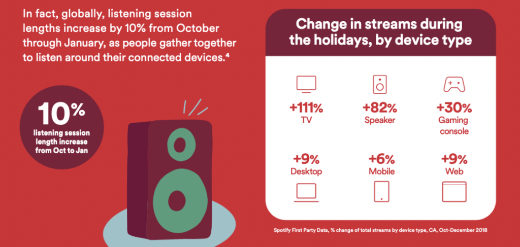 Selon Spotify, les Canadien.ne.s et les Américain.ne.s commencent à écouter de la musique de Noël dès le début du mois de novembre. Dans d’autres régions du monde, comme les Philippines, cela commence dès le mois de septembre! Nous commençons aussi à observer un changement dans la manière dont les gens consomment leur musique, passant d’une écoute en solo (dans la voiture, au travail, à la gym) à une écoute plus collective (via les télévisions connectées, les haut-parleurs intelligents et les consoles de jeu). On observe notamment une augmentation de la consommation sur tous les types d’appareils ainsi qu’une hausse de 10 % de la durée des sessions d’écoute entre les mois d’octobre et de janvier. La baisse des températures, les chutes de neige et les nuits plus longues sont tous des facteurs qui peuvent augmenter la consommation de musique, selon un sondage de The Economist.