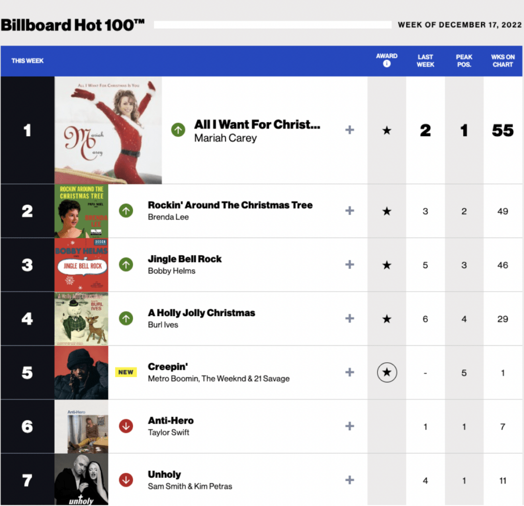 Il en va de même pour les palmarès : « Si vous regardez le Billboard Hot 100 une semaine donnée, c’est une série de titres qui changent constamment et qui sont remplacés par de nouvelles sorties. C’est ainsi que fonctionnent les classements musicaux », explique Nate Sloan, professeur à la Thornton School of Music de l’USC, dans une interview accordée à Marketplace. « Sauf en décembre, où tout à coup des chansons de 1934 commencent à apparaître à côté du dernier single de Justin Bieber ».