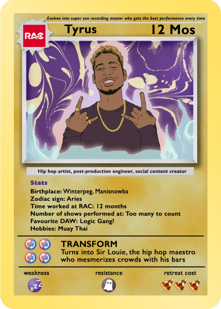 Tyrus : Honnêtement, comparé à certains des instructeurs de RAC, je ne suis qu’un débutant. Même si, un an après avoir obtenu mon diplôme de RAC, j’ai déjà acquis beaucoup d’expérience professionnelle et développé mes compétences, je ne suis encore qu’à la pointe de l’iceberg de ma carrière. Il y a toujours plus d’apprentissage à faire et plus de « reps » à obtenir. Pour l’instant, mes mixes sont les meilleurs qu’ils aient jamais été – et je suis sûr que dans un an, ils sembleront amateurs par rapport à ce que je ferai à ce moment-là.