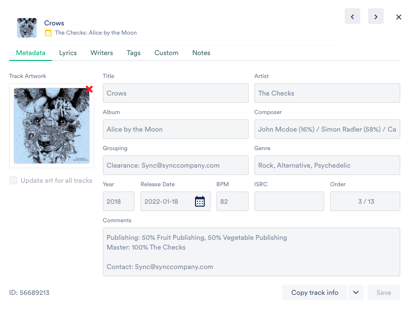 La dernière étape, mais non la moindre, pour préparer votre musique à la synchro est celle des métadonnées. Ce sont les données intégrées à vos fichiers musicaux contenant diverses informations, notamment les données d’édition, les paroles, la date de sortie, le BPM et plus encore.