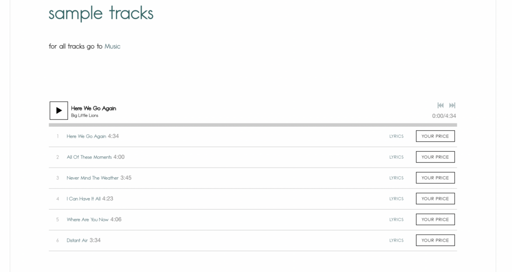 You can’t assume that everyone is familiar with your work, so be sure to actually include your music for people to listen to. You can do this by embedding an audio player in your website with a tracklist of all your songs, or adding album artwork that links to streaming platforms. It should be easy to find and your upcoming release should be the focus.