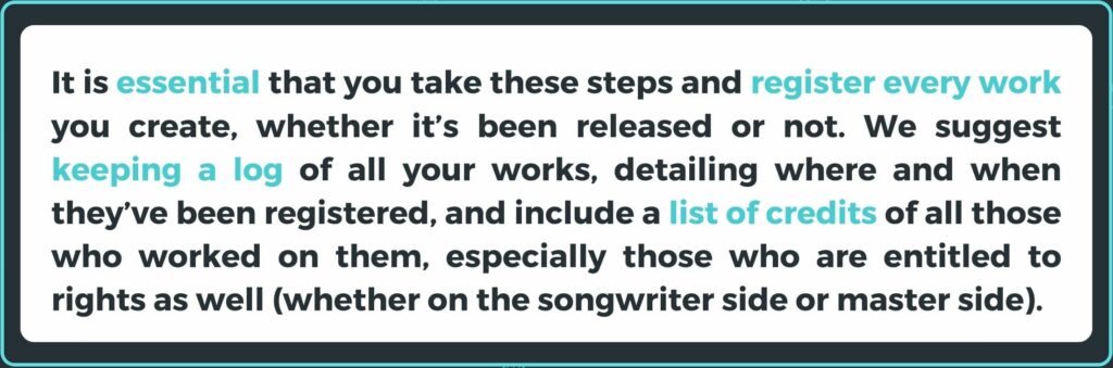 Not only is registering your musical works important for legal protection, but it is also how you get paid! These organizations collect and distribute the royalties that you earn as a songwriter and/or artist. The sheer number of different royalty streams in the music industry can be confusing and often even leads to rights owners losing out on their earnings simply because their work is not registered everywhere it should be.