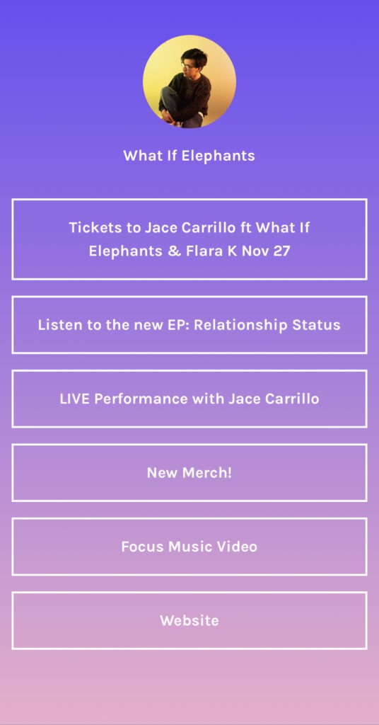 To put it simply, a smart link is used to host multiple links on one webpage. Though handy in many situations, it’s most often seen in social media bios, where you typically can only have one active link displayed. An artist’s or band’s Instagram page, for example, may have a smart link that leads to their website, their online merch page, their streaming platforms, their latest music video, their tour schedule, or any number of other things. It can also be useful in many other online places, like YouTube video descriptions, email newsletters, or in the form of a QR code. And, it allows you to get creative with your marketing! (e.g. Try using a smart link QR code in print, such as on free promotional goods at a concert.)