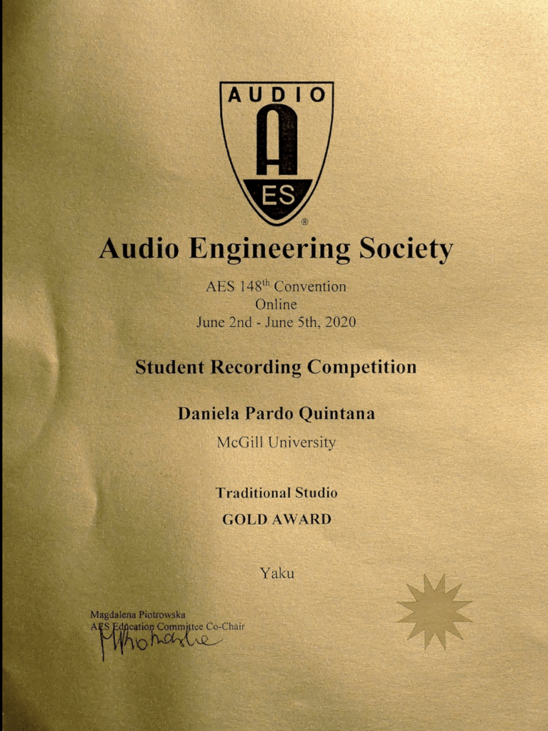Daniela: This profession has given me a lot of amazing experiences. I would say that winning several recording competitions when I was a student from 2017 to 2021 has been something very big for me, my family, my schools (Javeriana and McGill), and also my mentors.