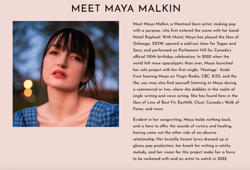 Your website bio will most likely be where you want to get the most in-depth about who you are and what you’ve achieved. If someone has taken the time to Google you, or to check out your personal URL, chances are they are genuinely curious about you and what you do. In the “About You” section of your website, it would make sense to include information about where you are from, where you’re based now, your influences, notable achievements so far, and what people can look forward to from you in the future.